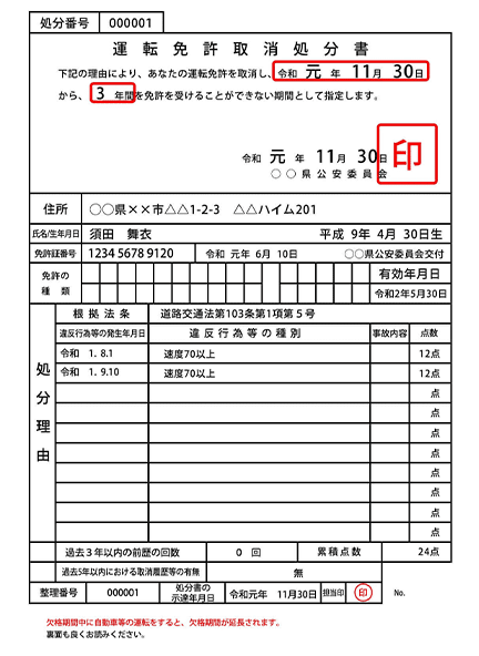 下記にご紹介させて頂いている『運転免許取消処分書』をお持ちの場合は、開始日と期間をご確認ください。